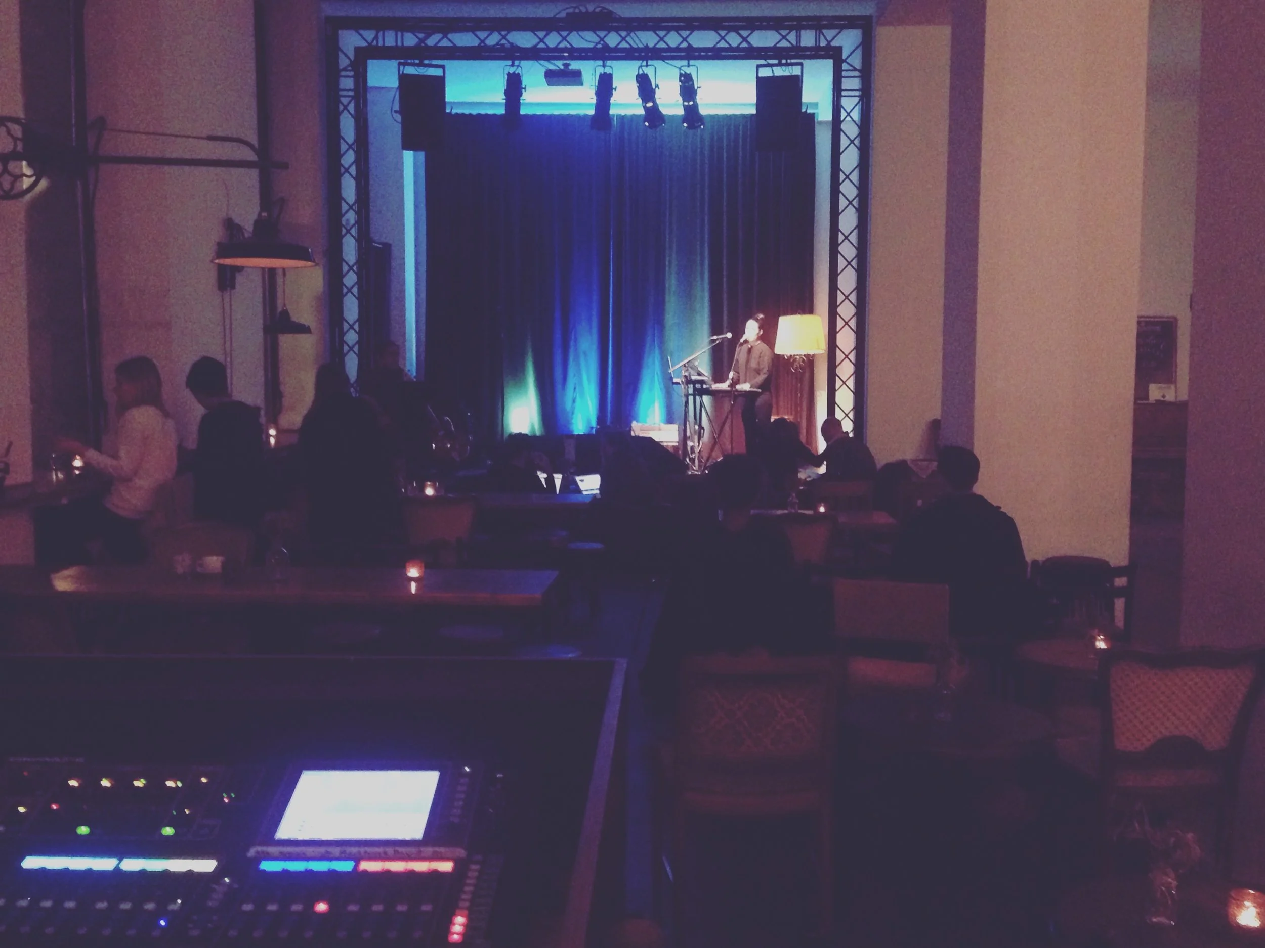 Tübingen, DE – On stage at Kino Löwen. It's the kind of theatre where you have to take your shoes off backstage so the audience won't hear the stairs creak and the light peaks through the cracks in the floor where you can watch the other acts performing below you. Tübingen is a beautiful city (see). That night there was a full moon and the clouds were racing in front of it illuminating the old facades and the cobblestone on the little street in front of the theatre.