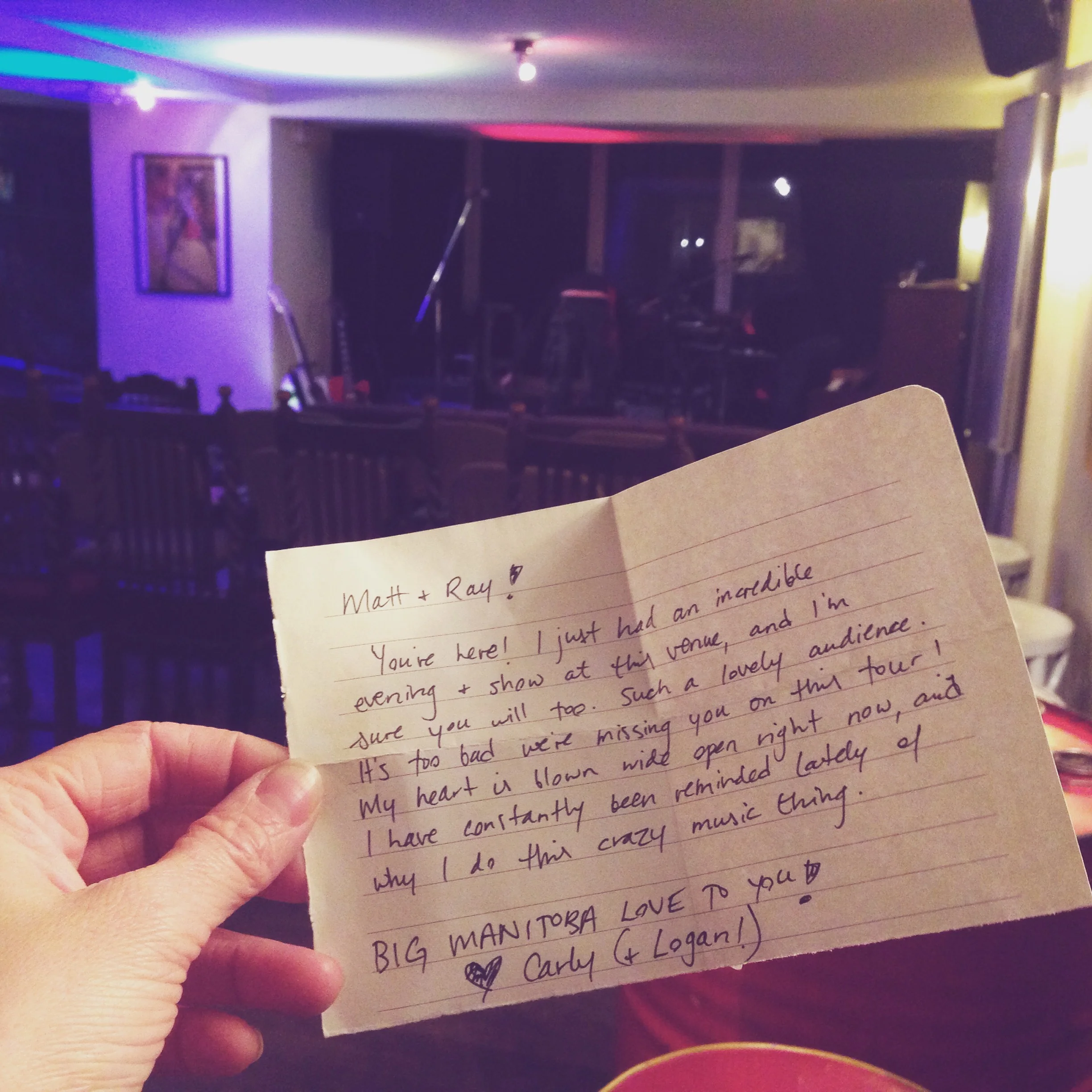 Köln, DE – A note left for us at the venue by fellow Winnipeger Carly Dow who had been there a week before.
